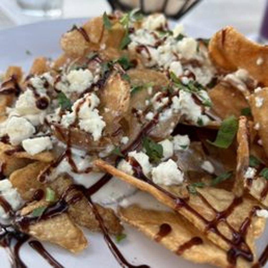 House-made potato chips drizzled with melted blue cheese and a balsamic glaze. Finished with crumbled bacon and scallions.
