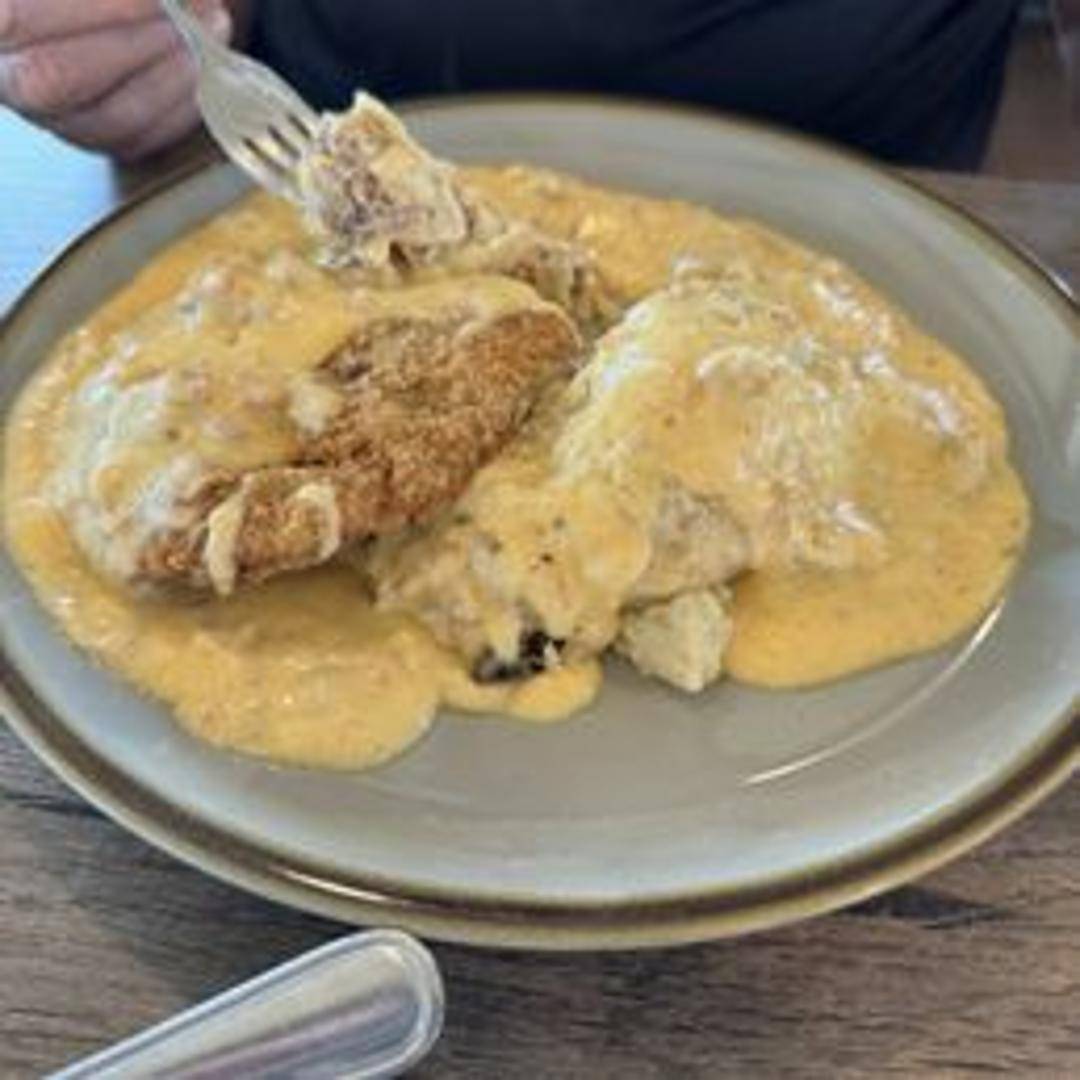 Hand-breaded steak, fried until golden and crispy, topped with a generous portion of pepper gravy. Served with your choice of two sides.