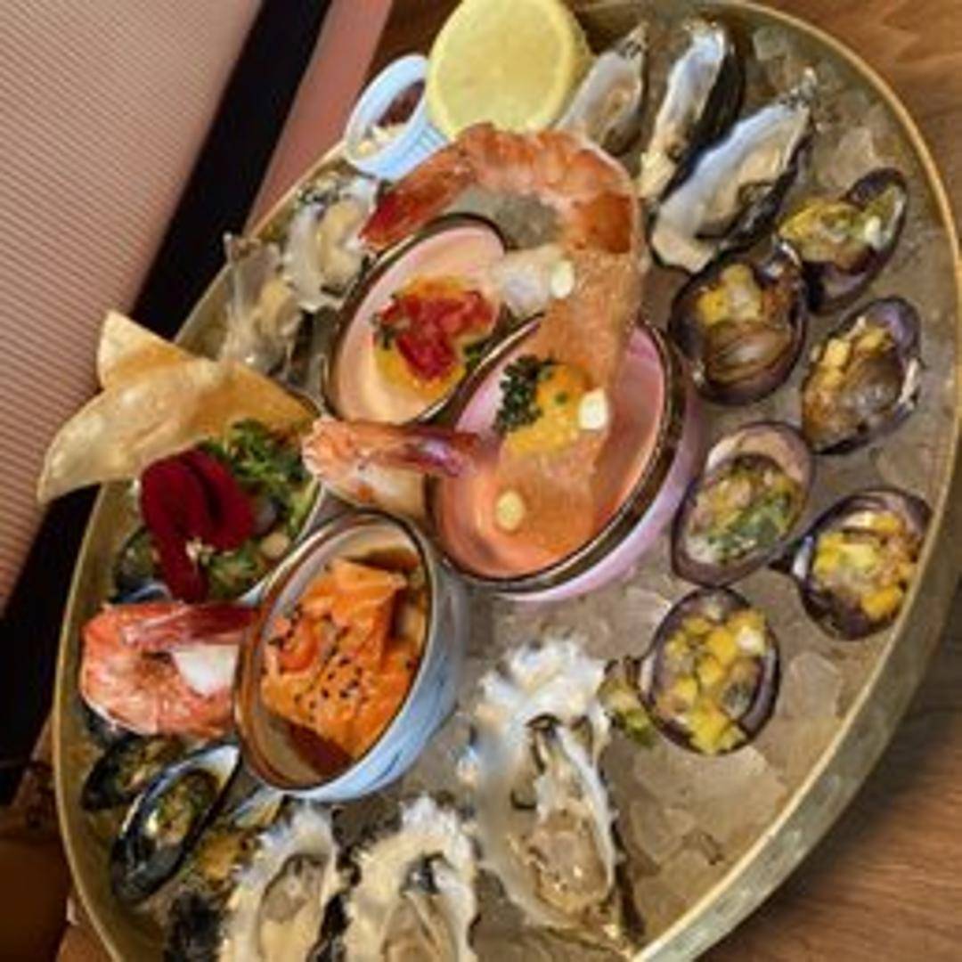A curated seafood platter featuring a selection of fresh oysters, clams, shrimp, and mussels. Served with mignonette, cocktail sauce, and lemon wedges.