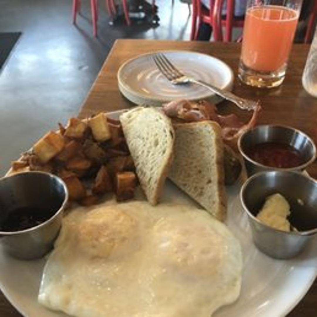 A hearty and satisfying start to your day, the Market Breakfast features your choice of eggs cooked to perfection, served alongside crispy strips of applewood-smoked bacon or savory sausage links. Accompanied by golden-brown home fries and your choice of toasted artisan bread or a flaky croissant, it's a timeless meal crafted with fresh ingredients.