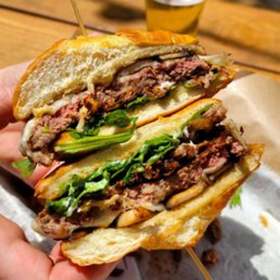 A delicious burger featuring a savory beef patty topped with sauteed mushrooms, crisp lettuce, ripe tomato, sliced onion, and your choice of condiments on a toasted bun.