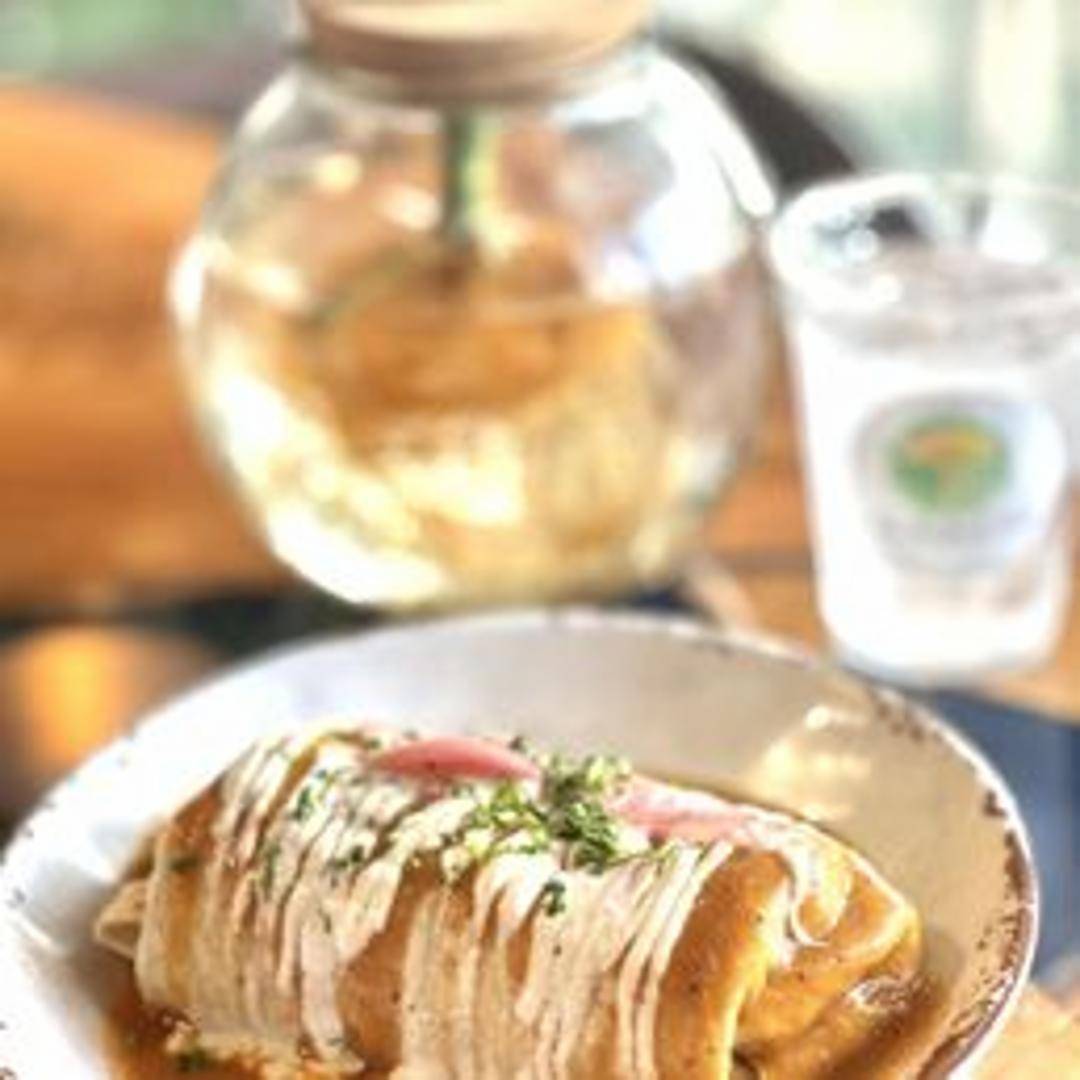 A large flour tortilla filled with your choice of grilled chicken or carne asada, rice, beans, and cheese. Smothered in our signature red enchilada sauce and melted cheddar cheese. Topped with sour cream and guacamole.