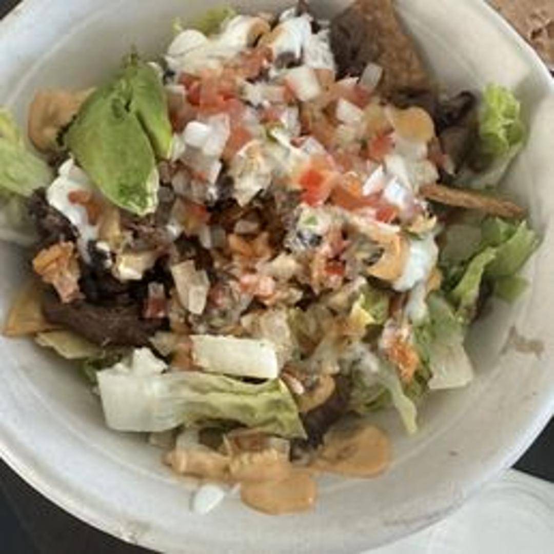 A customizable bowl filled with your choice of protein (chicken, beef, or vegetarian option), seasoned rice, black beans, corn, pico de gallo, shredded cheese, and a drizzle of creamy cilantro-lime dressing. Served with tortilla chips.