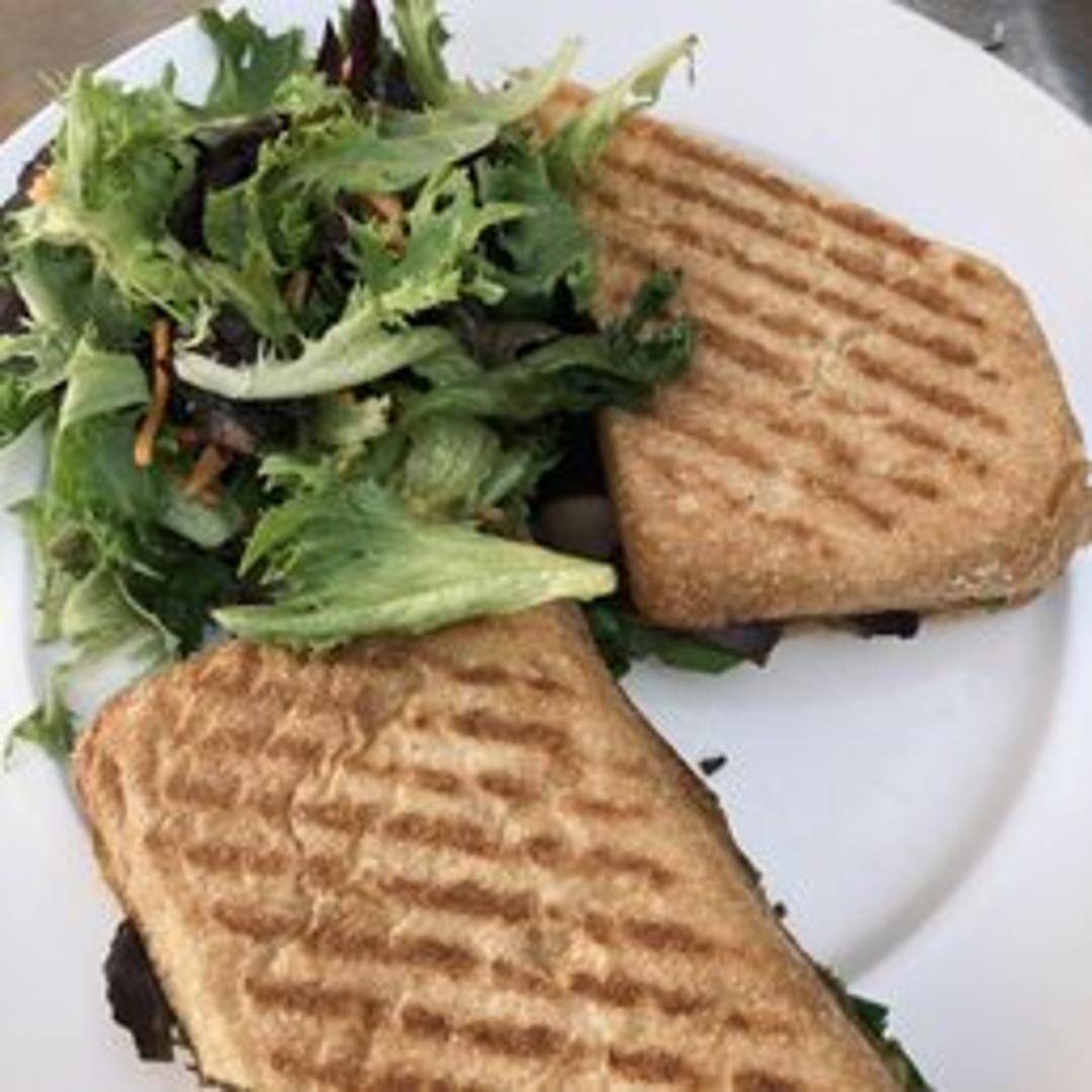A satisfying vegan sandwich or entree centered around a grilled or roasted portabella mushroom cap. Marinated for enhanced flavor, the mushroom serves as a hearty meat substitute, often layered with roasted red peppers, spinach, caramelized onions, and a vegan spread, all served on bread or as a main dish.