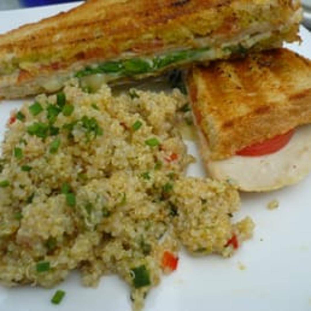 A vibrant and fresh panini, artfully combining creamy white ingredients, such as fresh mozzarella or provolone cheese, with crisp green elements like spinach, pesto, or basil. This grilled sandwich offers a delightful texture and a burst of garden-fresh flavors, perfectly pressed until golden.