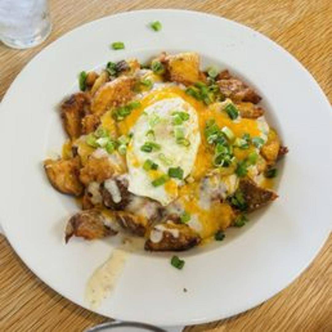 Crispy french fries topped with cheese curds, breakfast gravy, and a fried egg.