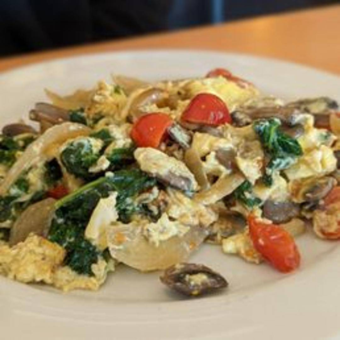 Scrambled eggs with a medley of fresh vegetables, including bell peppers, onions, mushrooms, and spinach.