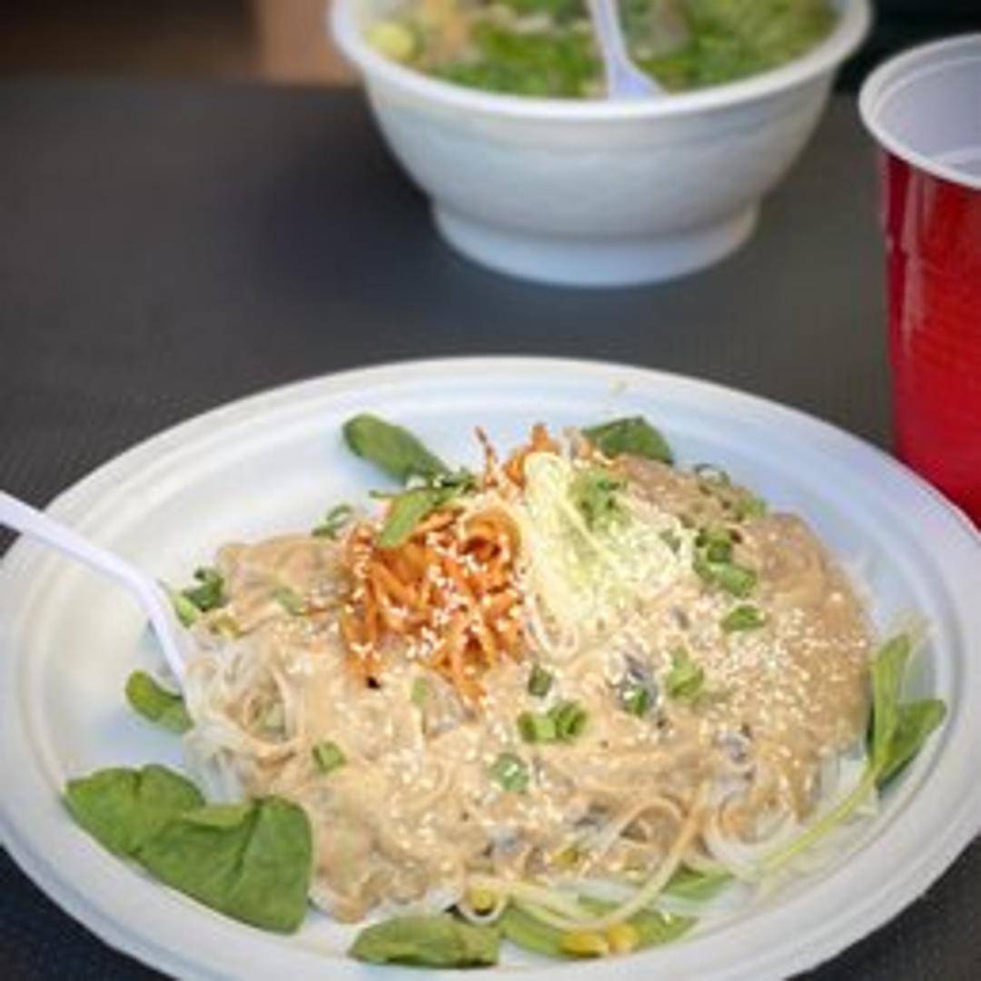 A comforting dish of wheat noodles tossed in a rich and creamy sesame sauce. Garnished with fresh scallions and toasted sesame seeds for added texture and flavor.