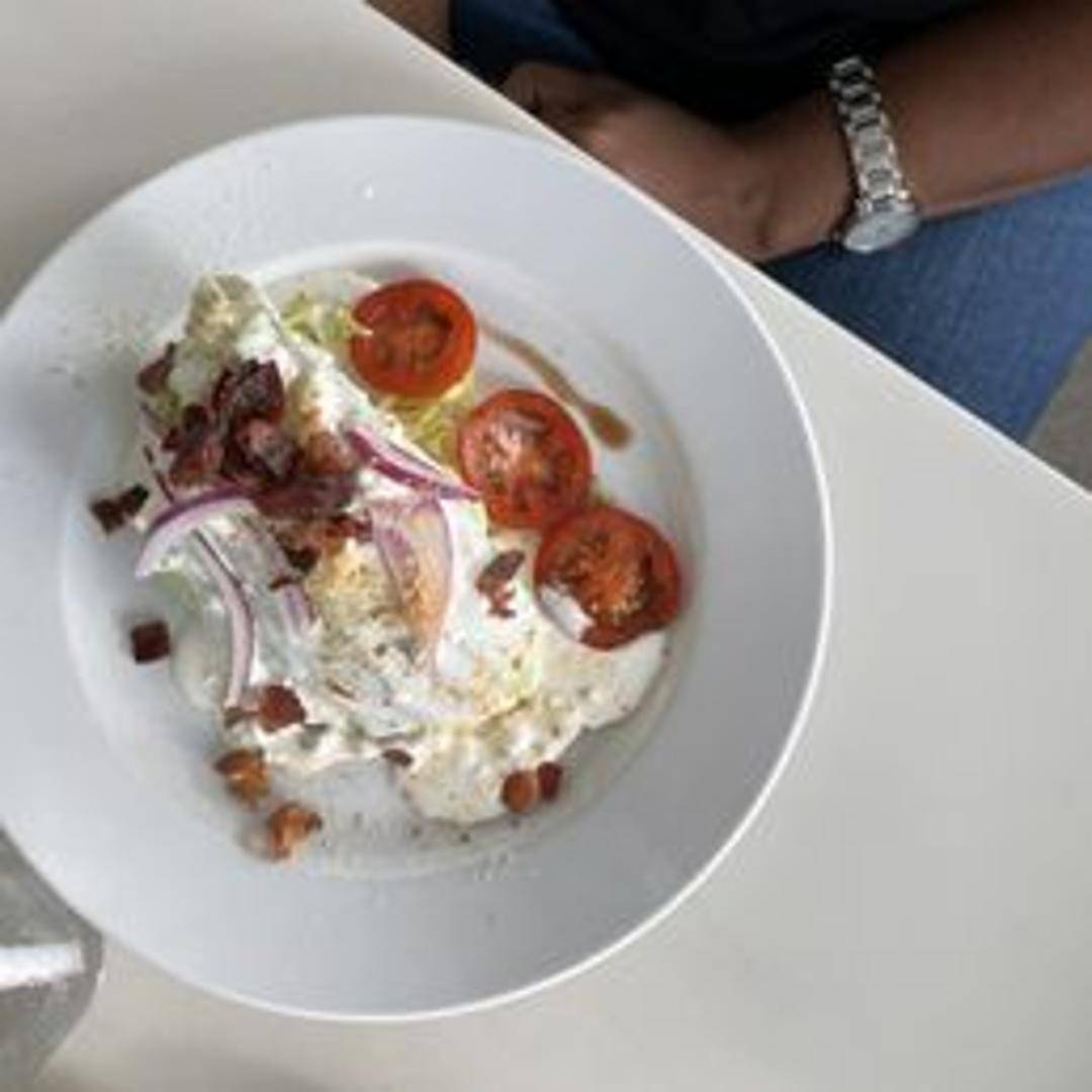 A classic and refreshing salad featuring a crisp wedge of iceberg lettuce topped with creamy blue cheese dressing, crumbled bacon, and diced tomatoes. Often garnished with red onion, chives, or a balsamic glaze for added flavor and visual appeal.
