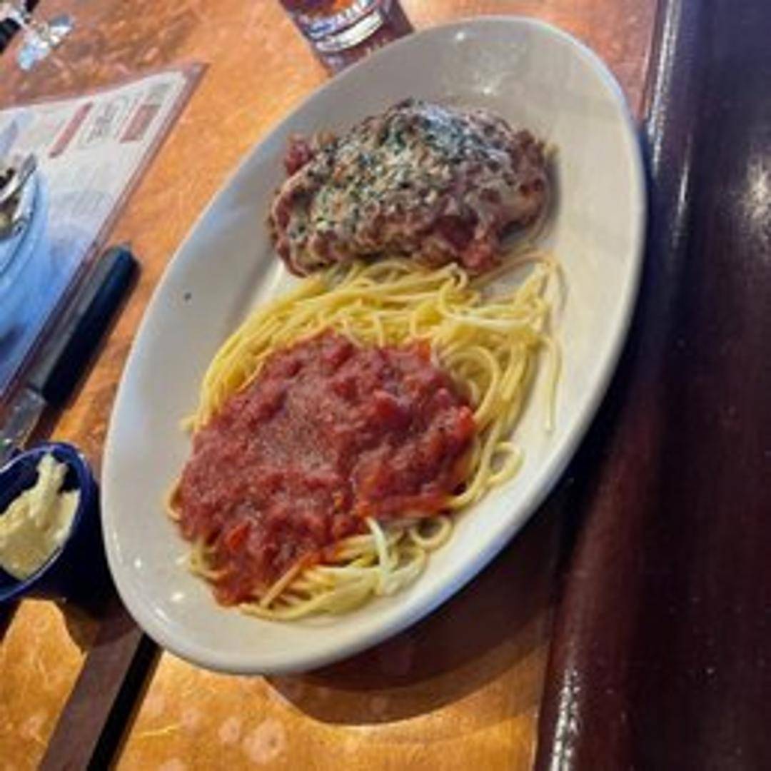 A breaded and pan-fried chicken breast smothered in marinara sauce and melted mozzarella cheese. Served with a side of spaghetti.