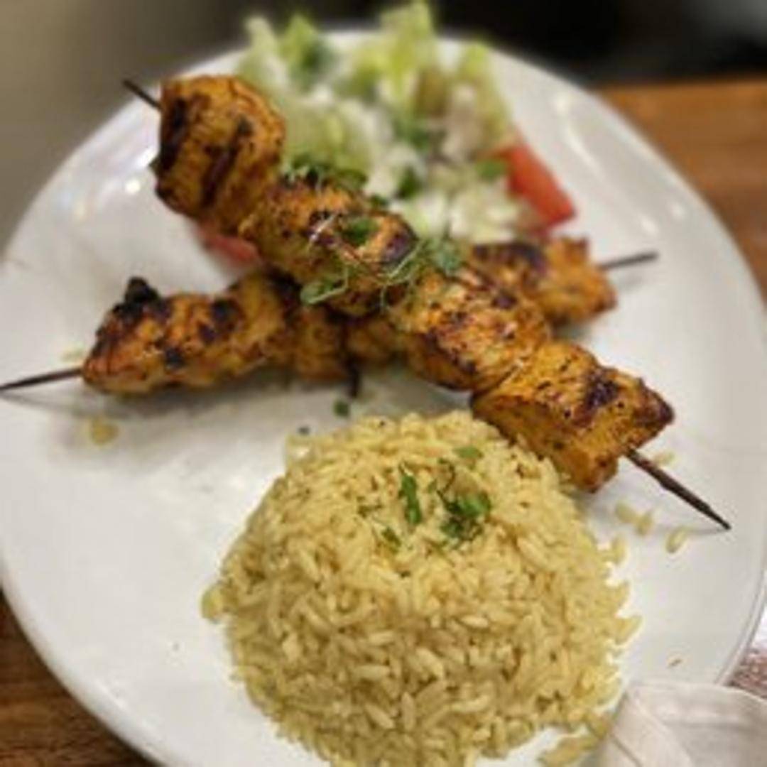 Marinated chicken pieces grilled on a skewer, served with rice pilaf, grilled vegetables, and your choice of sauce.