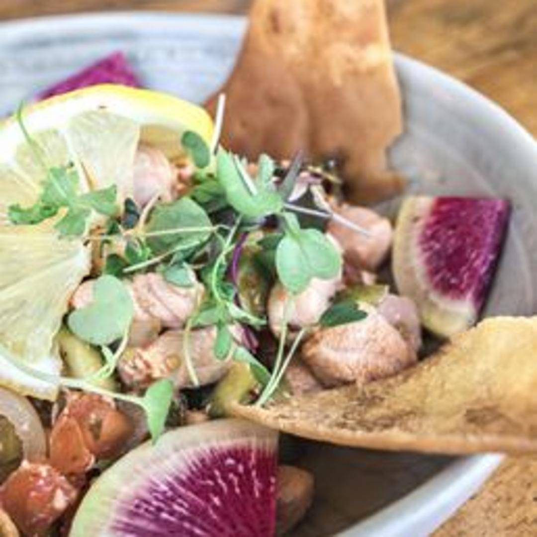 Fresh, diced salmon marinated in citrus juices with cilantro, onions, and peppers. A light and zesty appetizer.