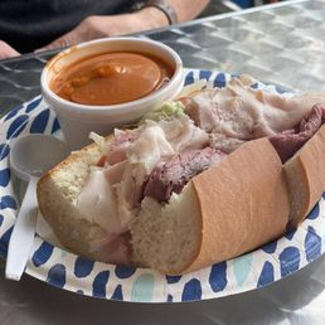 A signature cold sandwich featuring a combination of thinly sliced deli meats (such as pastrami, corned beef, and roast beef), Swiss cheese, lettuce, tomato, onion, and your choice of mustard or mayonnaise, served on a fresh roll or bread.