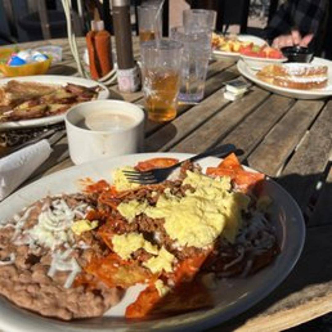 Crispy tortilla chips simmered in a flavorful red or green salsa, topped with two fried eggs, queso fresco, and crema. Served with refried beans.