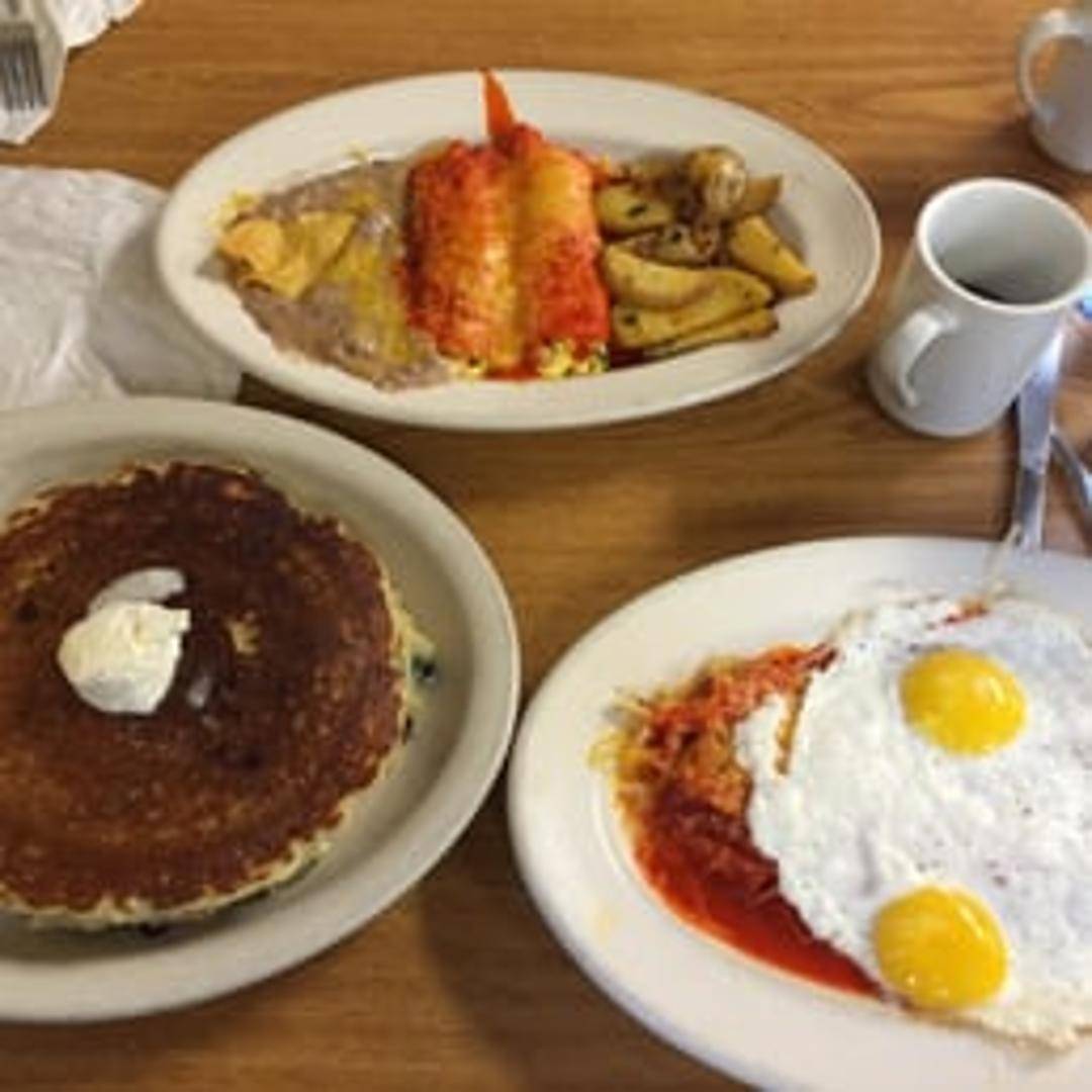 A fluffy, golden pancake bursting with juicy blueberries. Served with butter and maple syrup.