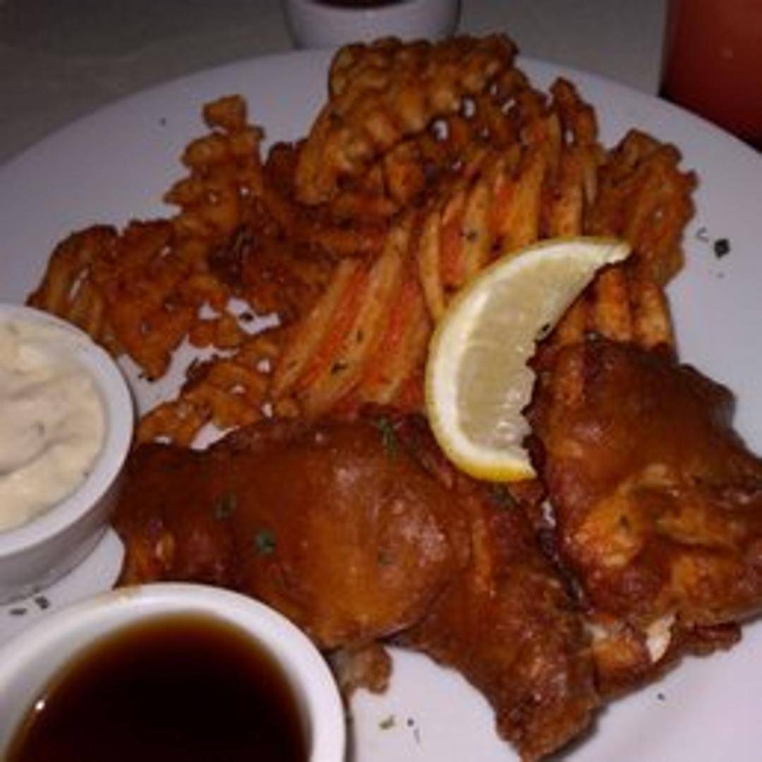Crispy beer-battered cod served with thick-cut fries, tartar sauce, and a lemon wedge.