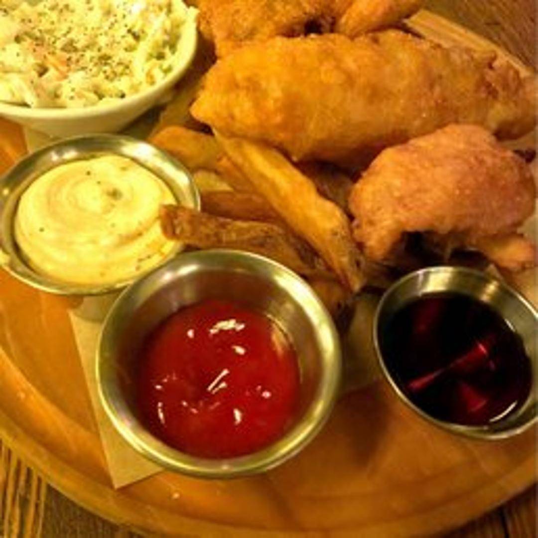 Crisp, golden-battered fresh white fish, typically cod or haddock, fried to perfection, ensuring a flaky and tender interior. Served alongside perfectly seasoned, thick-cut golden fries and a side of creamy house-made tartar sauce, embodying a beloved British pub classic.