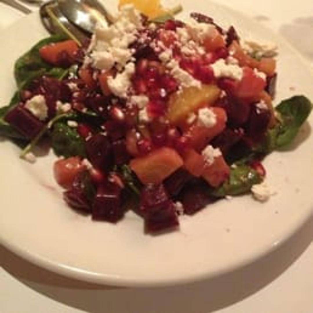 A vibrant salad featuring roasted beets, crumbled goat cheese, candied walnuts, mixed greens, and a light vinaigrette dressing. The sweetness of the beets complements the tangy goat cheese and crunchy walnuts, all balanced by the fresh greens and vinaigrette.