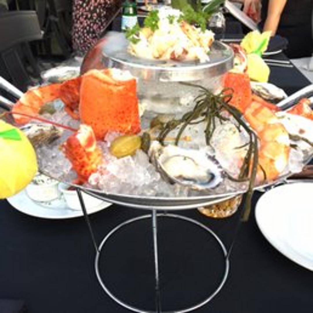 An impressive multi-tiered display of the freshest, chilled seafood, meticulously arranged for a grand presentation. This opulent tower typically features a selection of premium items such as Alaskan King Crab legs, jumbo shrimp, succulent lobster tails, and pristine oysters, served with cocktail sauce and mignonette for an ultimate raw bar experience.