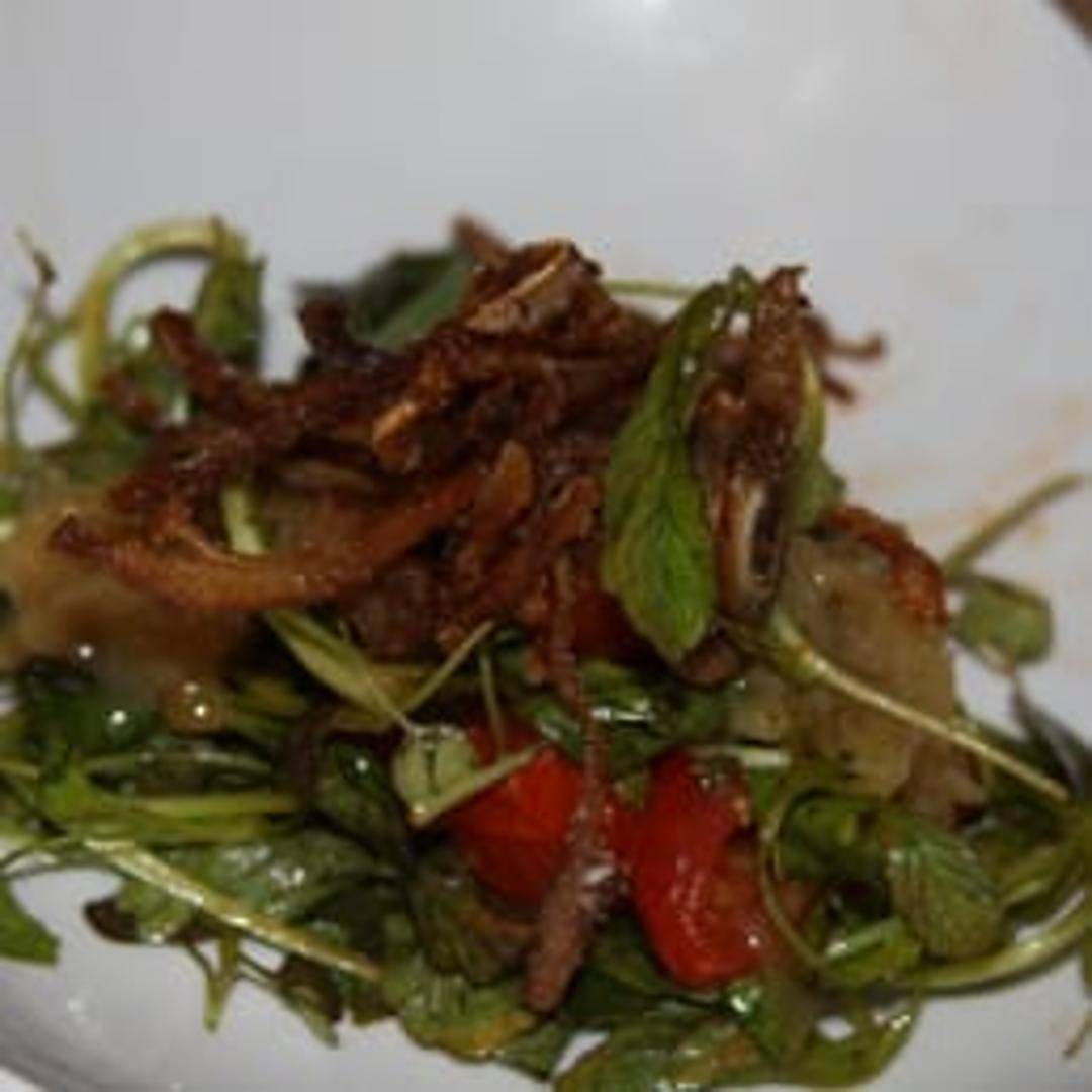 Thinly sliced pig ears, often prepared to achieve a delightful chewiness or crispness, tossed with fresh, vibrant greens and other complementary ingredients in a light, zesty dressing. This salad offers an intriguing textural experience with a savory depth.