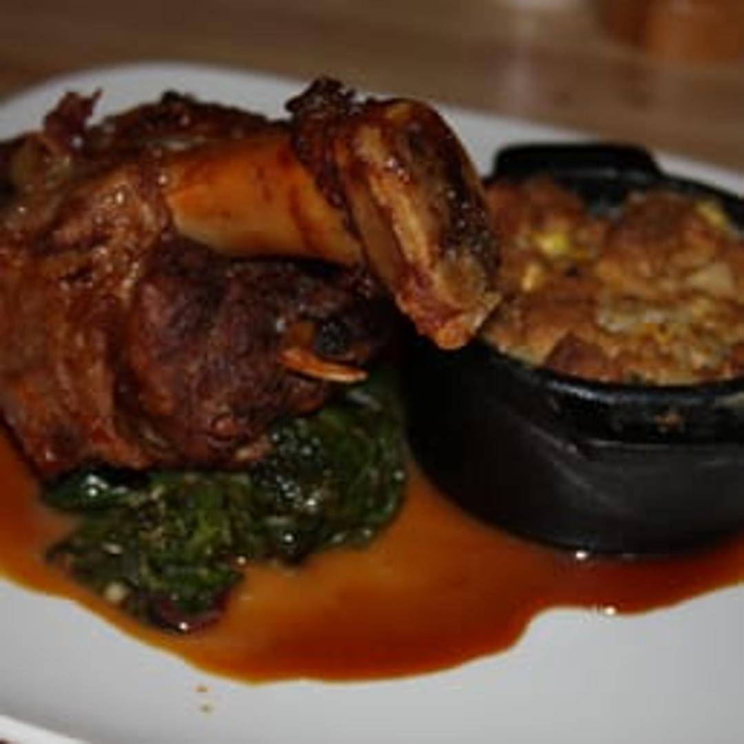A substantial and succulent pork shank, slow-cooked until exceptionally tender and falling off the bone, then finished to achieve a beautifully golden and crackling crisp skin. This dish offers a delightful contrast of textures and a rich, deeply savory flavor.