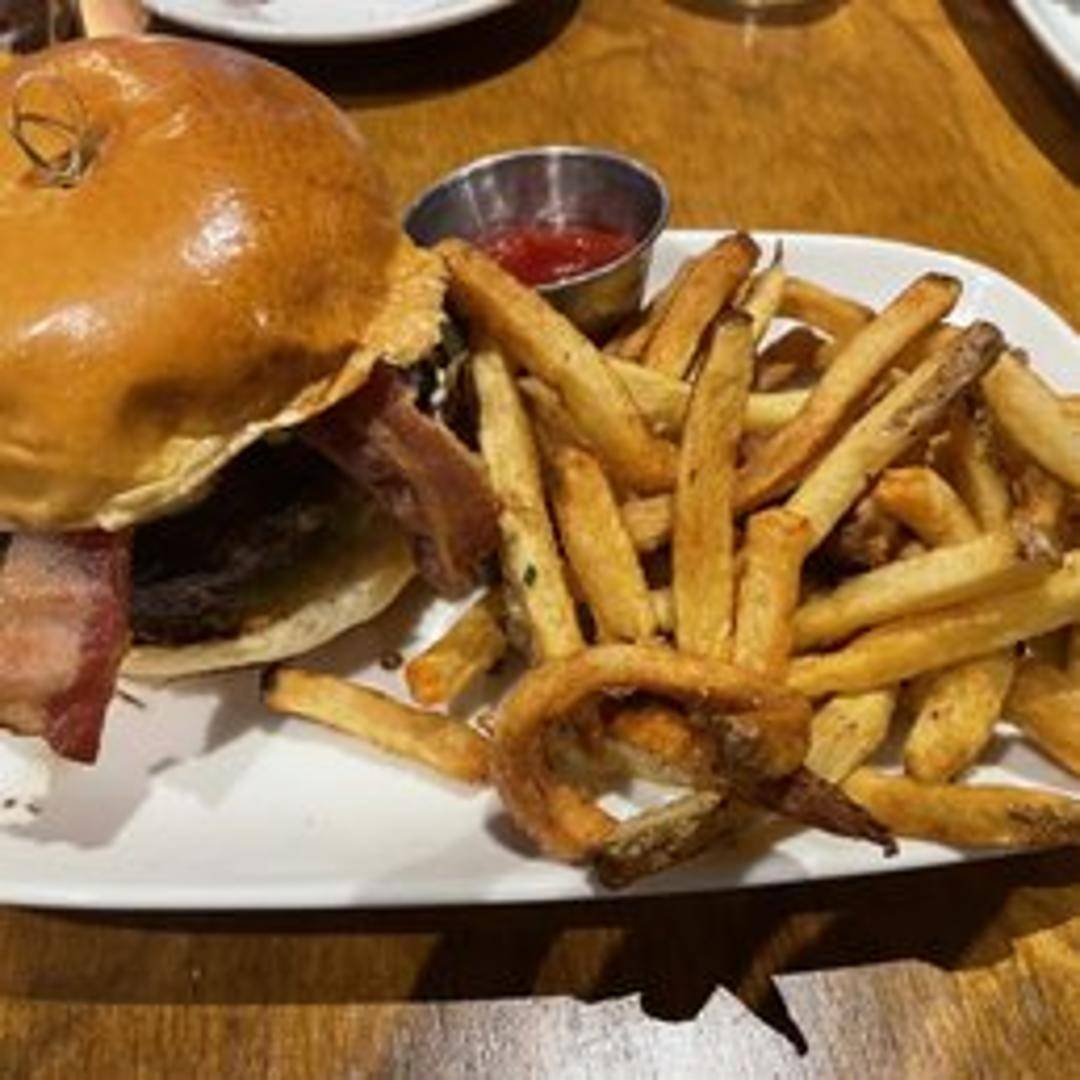 Our signature burger, crafted with a perfectly seasoned, juicy prime beef patty, seared to your preferred temperature. Nestled on a toasted brioche bun with crisp lettuce, ripe tomato, red onion, house-made pickles, and our special Pinemoor sauce. Served with a side of golden, crispy fries.
