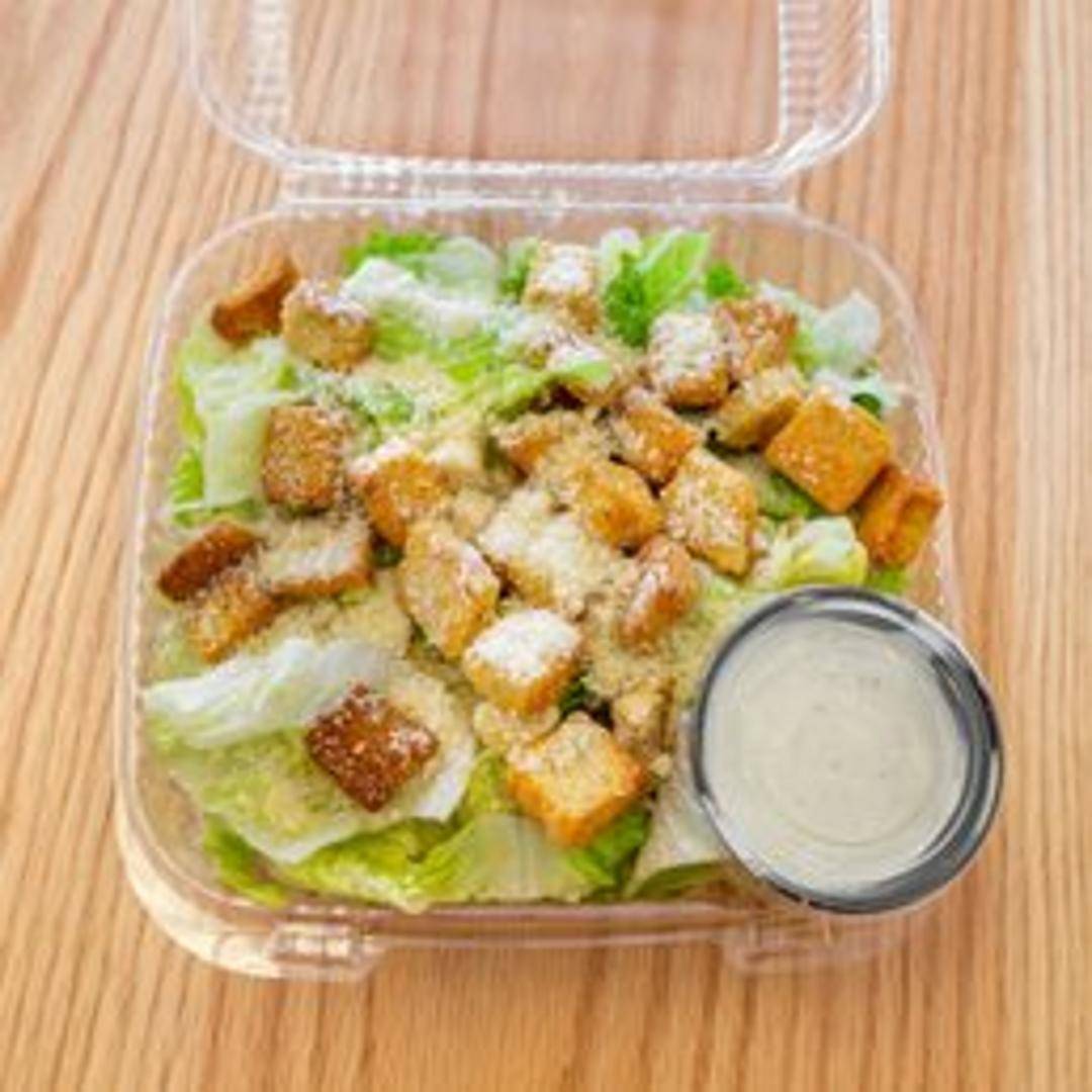 A crispy pizza crust topped with creamy Caesar dressing, grilled chicken, crisp romaine lettuce, parmesan cheese, and crunchy croutons. A refreshing and flavorful pizza experience.