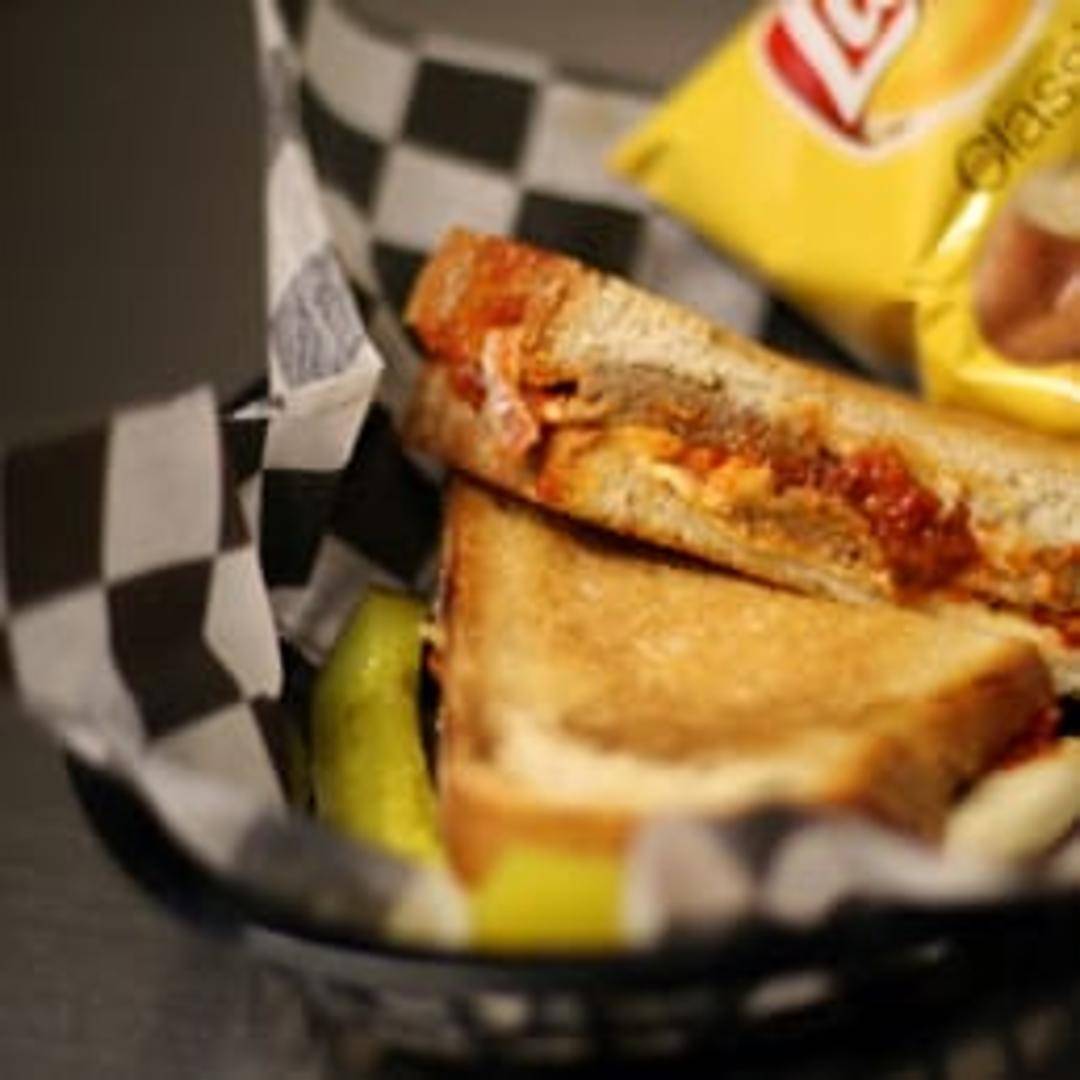 Homemade meatballs, smashed and simmered in marinara sauce, topped with melted mozzarella cheese and served on a toasted roll.