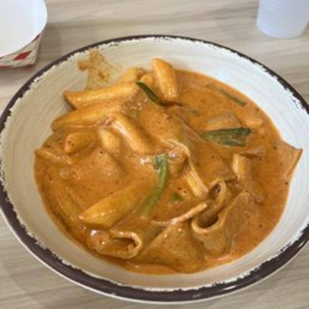 Chewy rice cakes in a creamy, slightly spicy rose-colored sauce. Often includes fish cakes and vegetables.