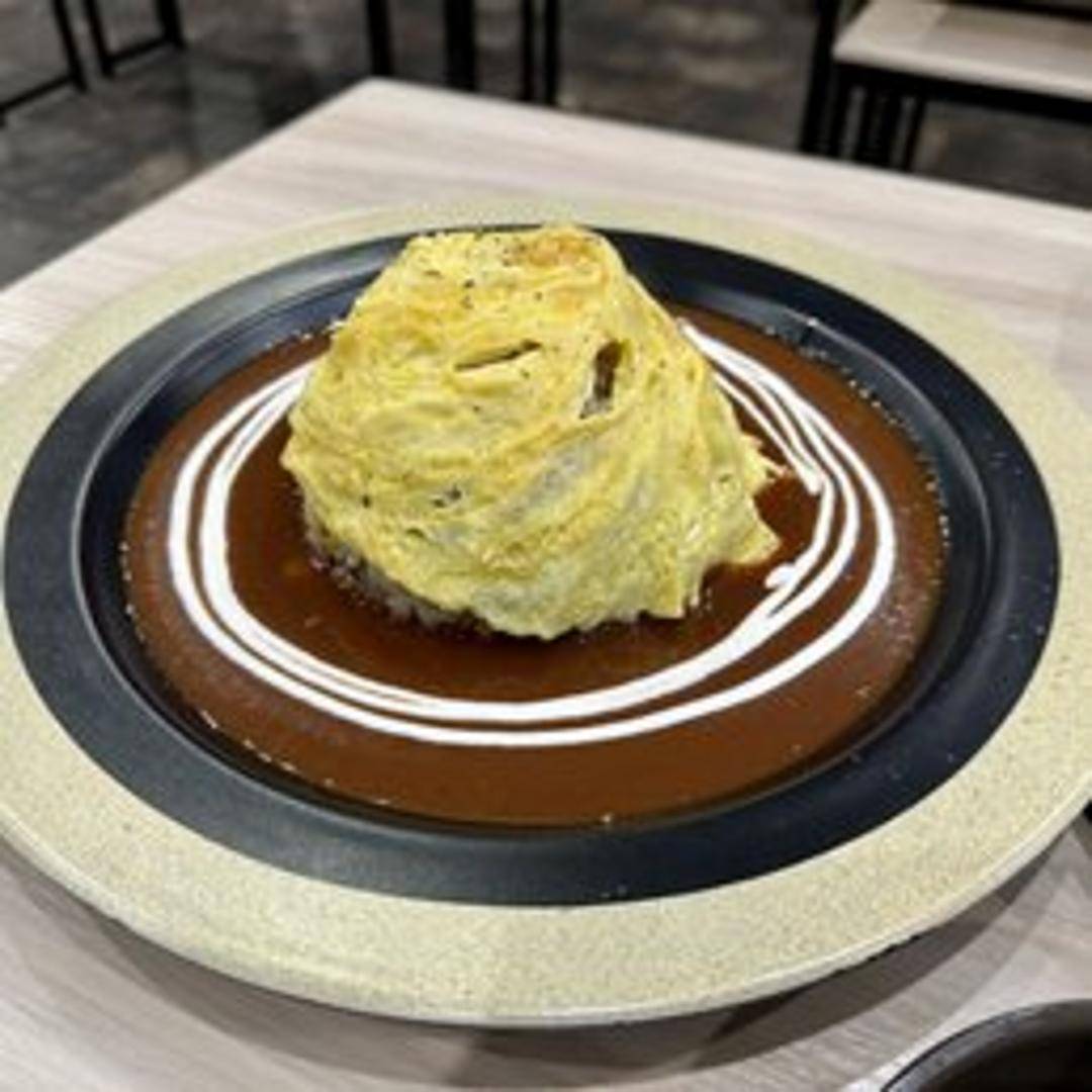Fried rice artfully swirled and topped with a thin omelet, creating a tornado shape. Contains meat, vegetables, and a flavorful sauce.