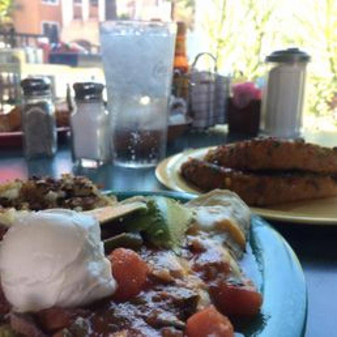 A large flour tortilla filled with scrambled eggs, potatoes, cheese, and your choice of bacon, sausage, or ham. Served with salsa.