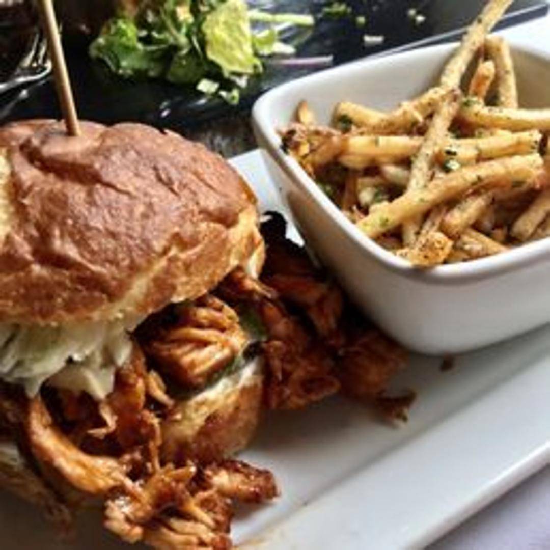 Grilled chicken breast smothered in tangy BBQ sauce, topped with crispy onions and melted cheddar cheese, served on a toasted brioche bun with a side of coleslaw.
