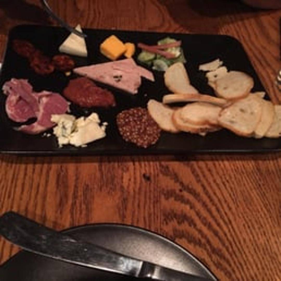 A curated selection of artisanal cheeses, cured meats, olives, and accompaniments, served with toasted baguette slices.