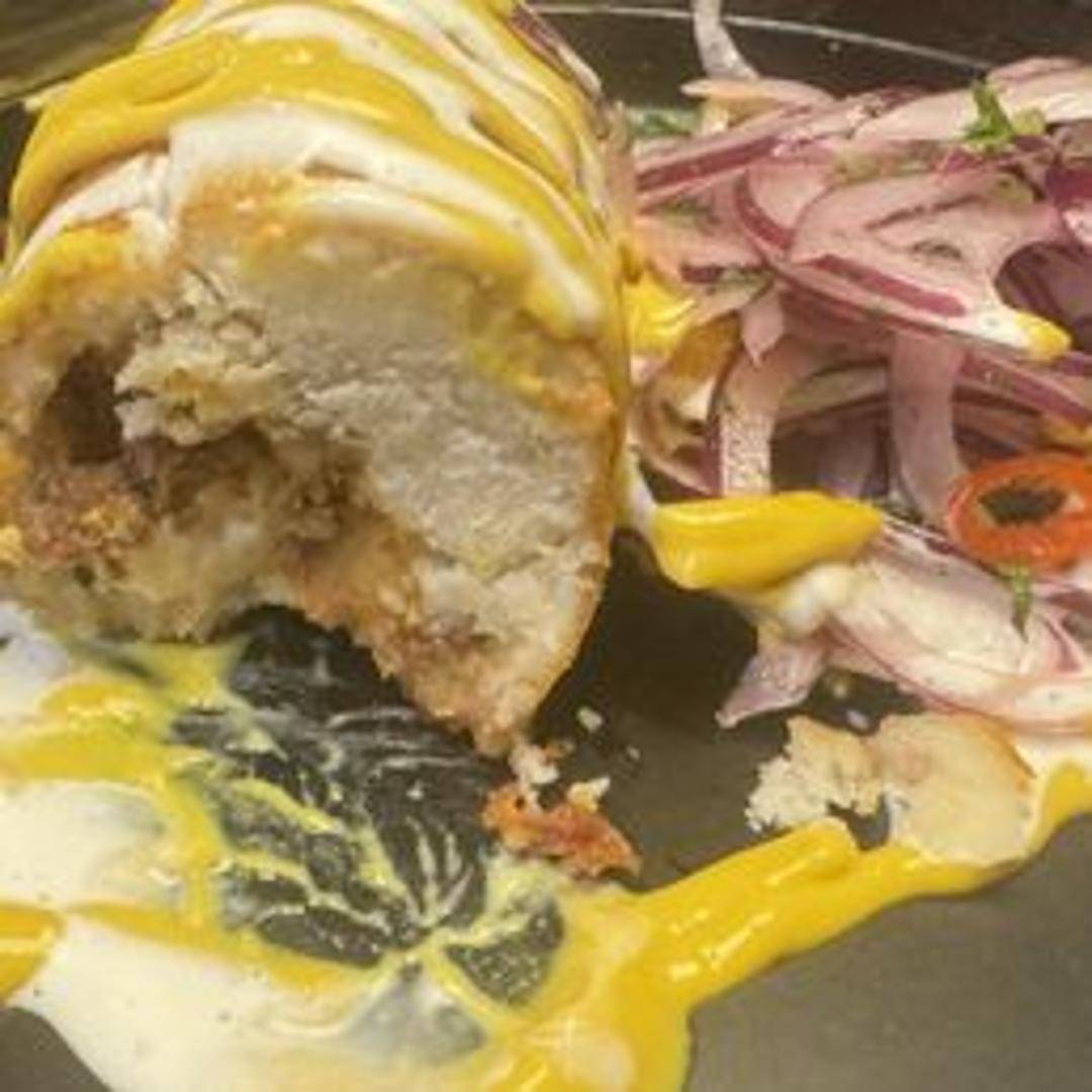 A Peruvian stuffed potato, mashed and shaped into a ball or oval, filled with a savory mixture of seasoned ground beef, onions, olives, raisins, and hard-boiled egg. The filled potato is then deep-fried until golden brown.