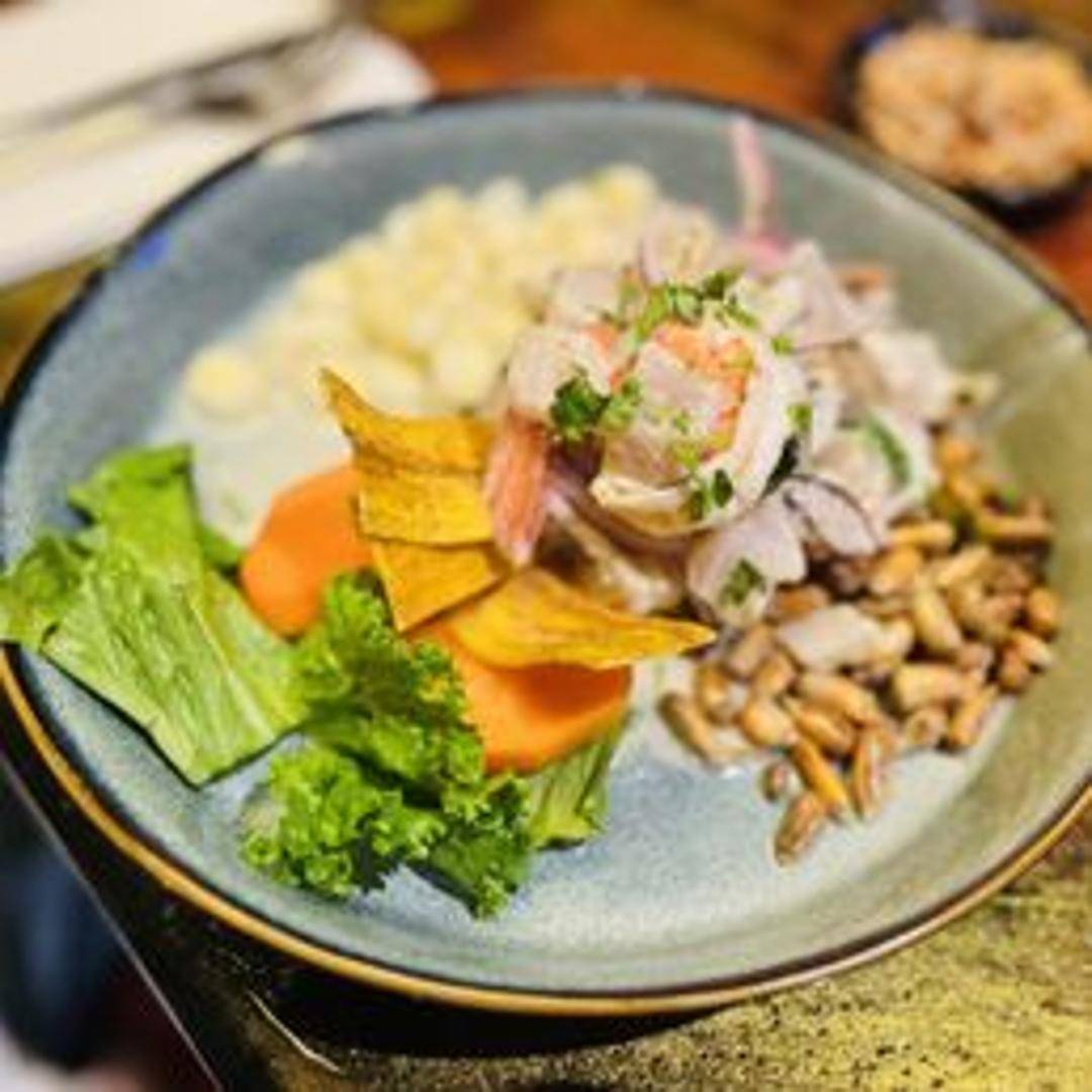Fresh seafood marinated in lime juice with red onions, cilantro, and Peruvian peppers. Includes a mix of fish, shrimp, and calamari.