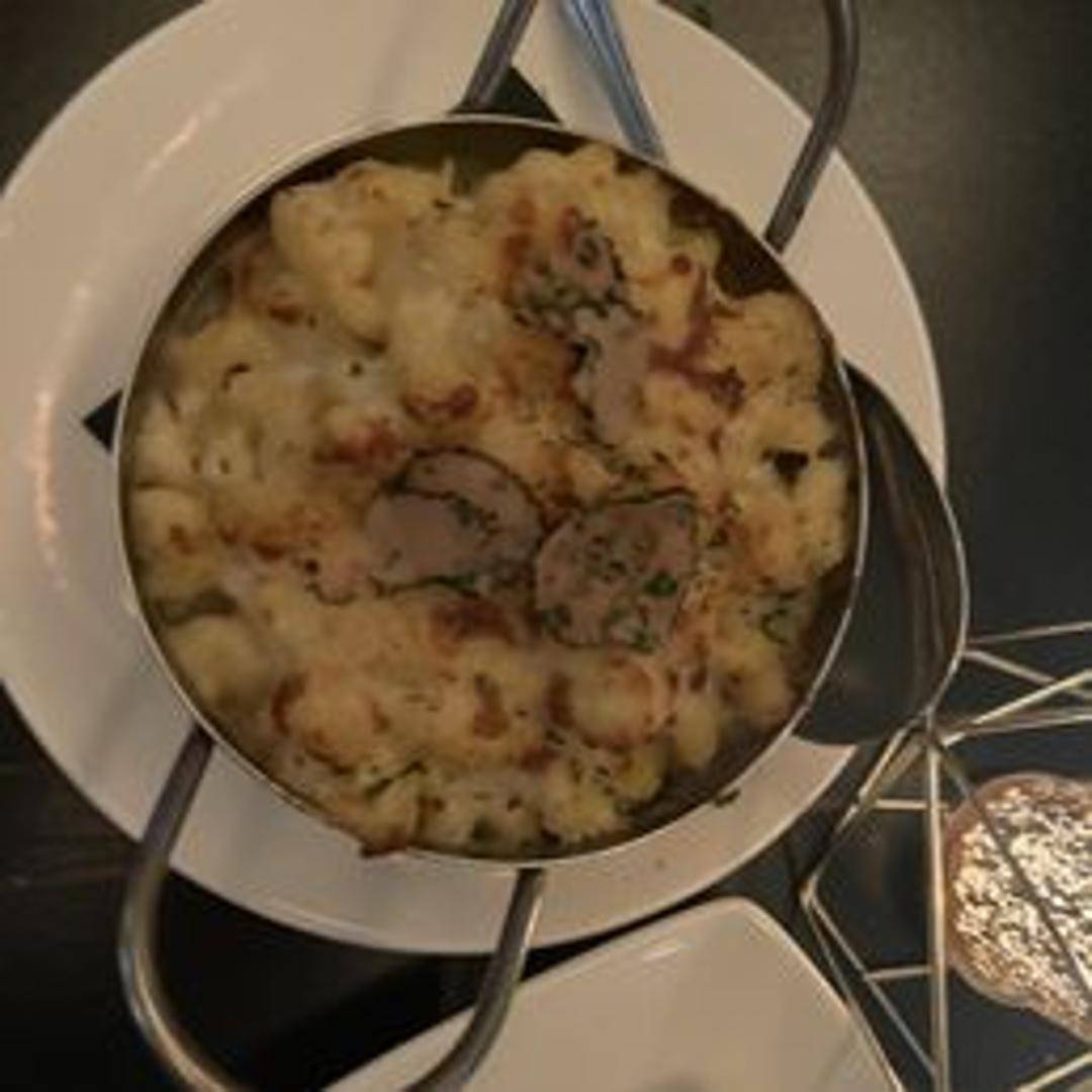 Elbow macaroni smothered in a decadent cheese sauce infused with truffle oil, creating a luxurious and aromatic side dish.
