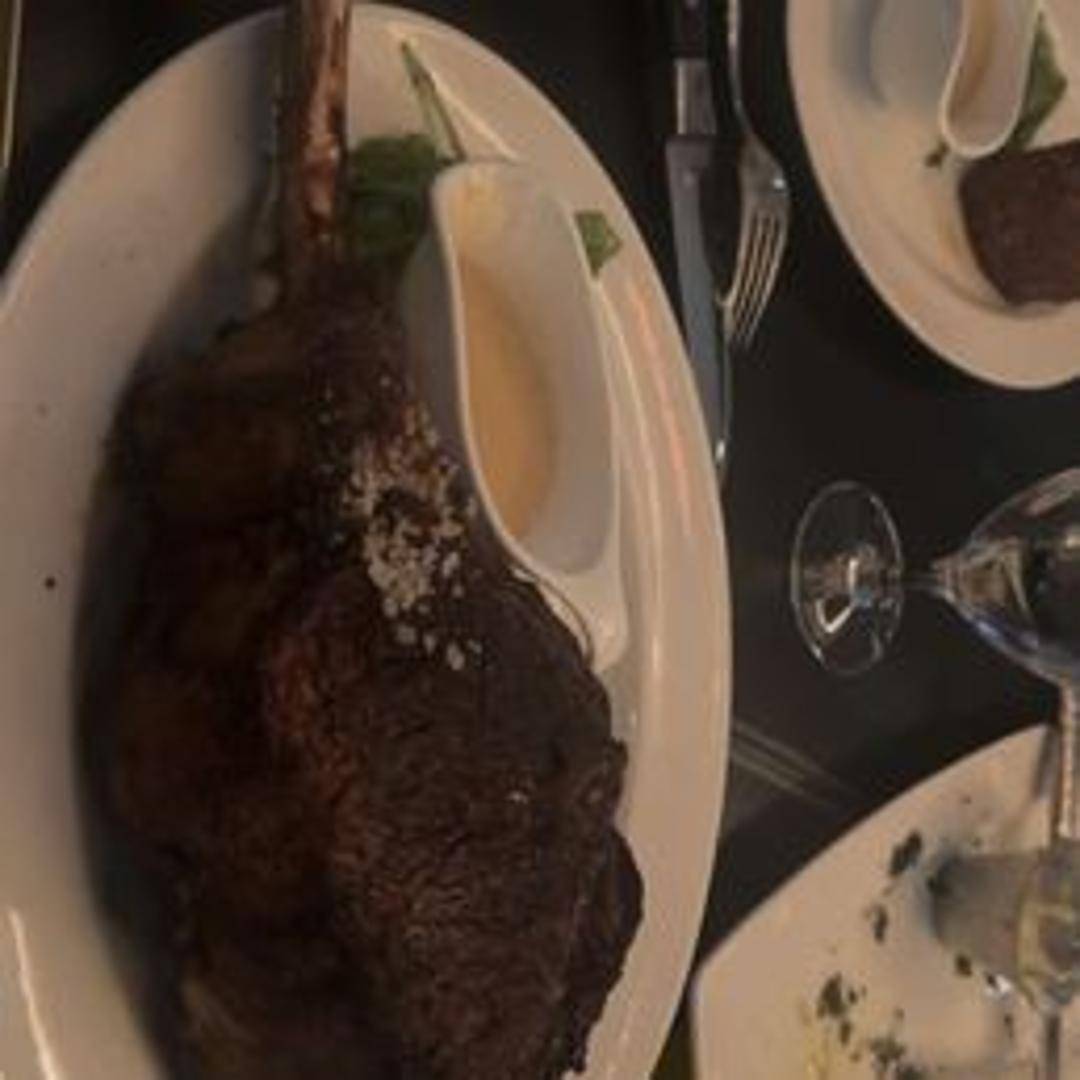 A bone-in ribeye steak, known for its impressive presentation and robust flavor, expertly grilled and finished with butter.