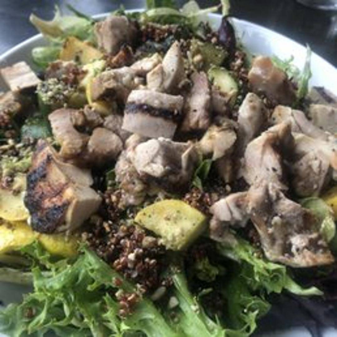 A vibrant salad featuring mixed greens, quinoa, avocado, roasted sweet potatoes, chickpeas, toasted almonds, and a lemon vinaigrette.