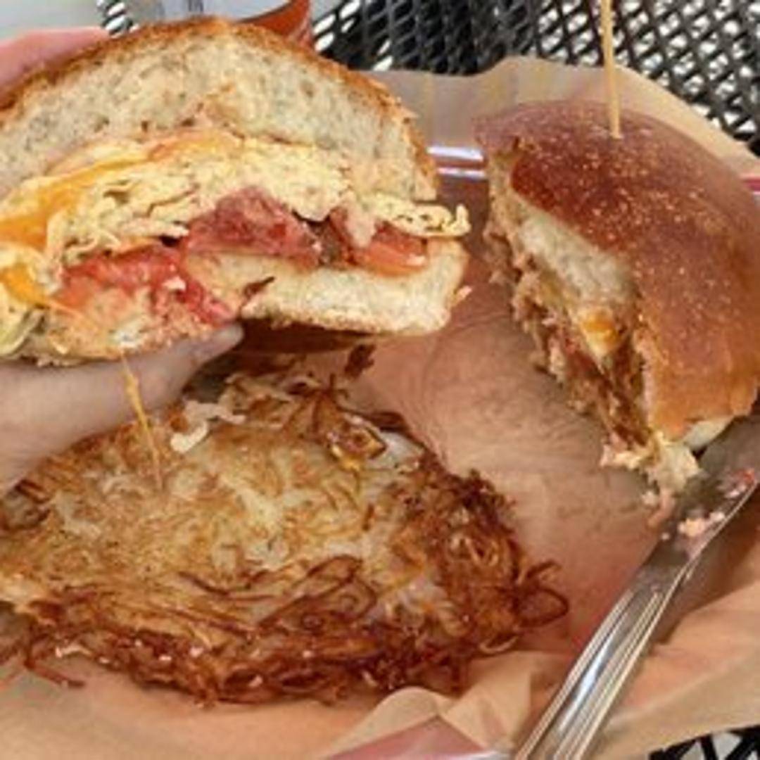 Start your day right with our hearty breakfast sandwich, featuring a fluffy fried egg, savory melted cheese, and your choice of crispy bacon, tender sausage, or sliced ham. All served on a warm, toasted artisan roll or your preferred bread, ensuring a satisfying morning meal.