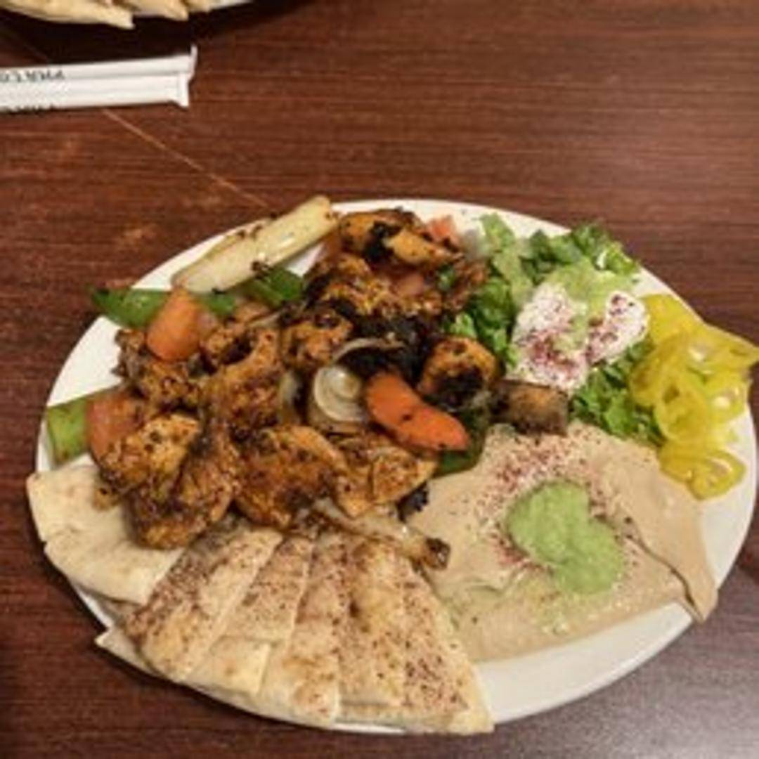 Skewered and grilled chicken kabob, marinated in a blend of Middle Eastern spices. Served with rice, grilled vegetables, and a side of sauce.