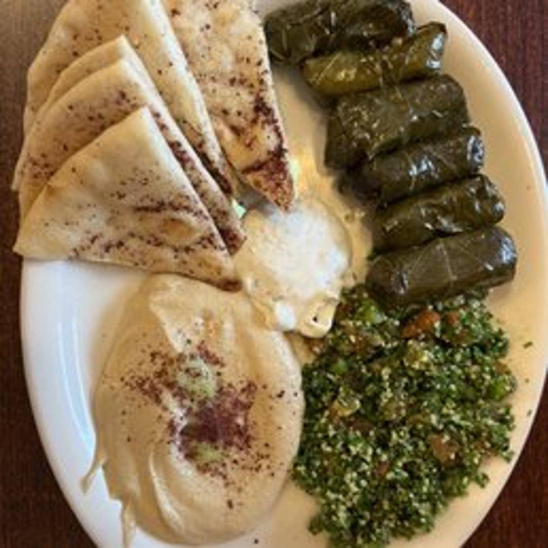 Grape leaves stuffed with a savory mixture of rice, herbs, and spices. Served as a platter with a side of yougurt dip and vegetables.