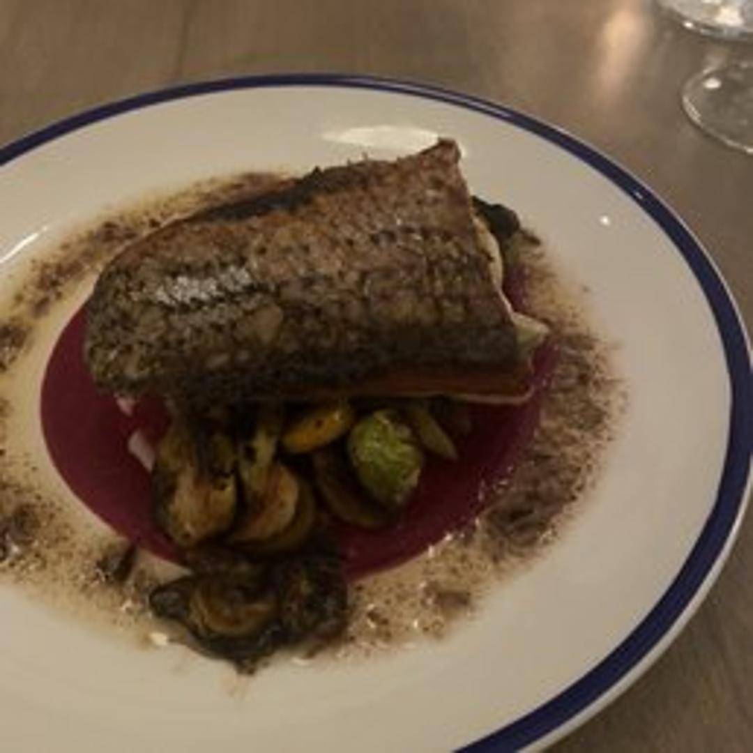 A perfectly pan-seared rockfish fillet featuring an exquisitely crispy skin that contrasts beautifully with its moist, flaky white flesh. Expertly prepared to highlight the fish's natural flavors, often served with seasonal accompaniments.