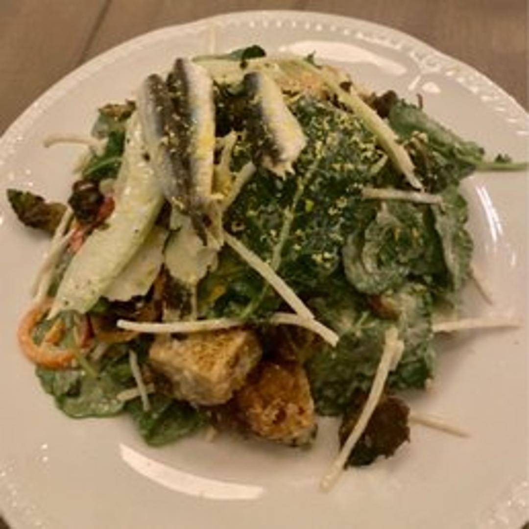 A fresh and vibrant salad showcasing tender kale massaged with a creamy, zesty Caesar dressing. Topped with crunchy garlic croutons, generous shavings of Parmesan cheese, and a hint of fresh lemon.