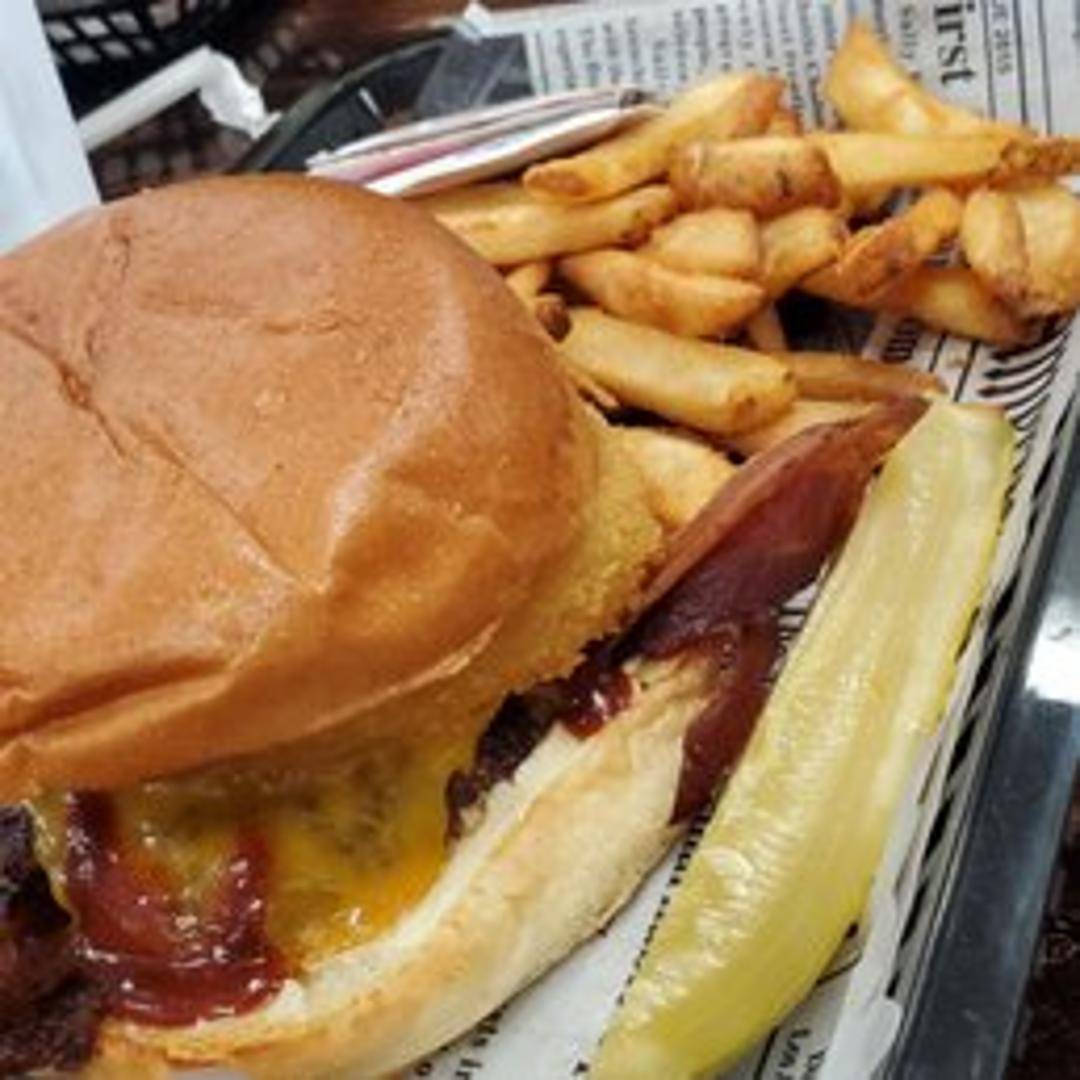 A juicy burger patty topped with crispy onion rings, tangy BBQ sauce, melted cheddar cheese, crisp lettuce, and fresh tomato, served on a toasted bun.