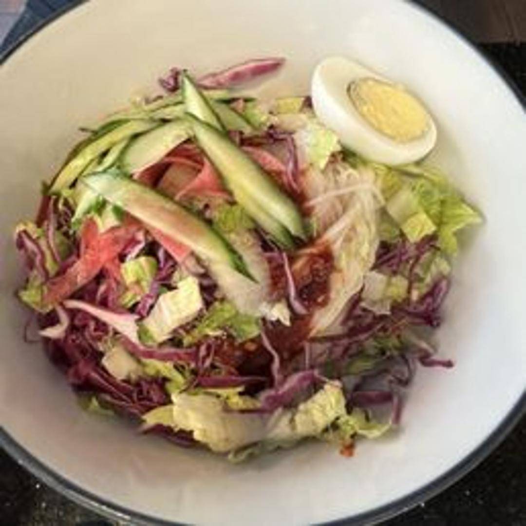 Wheat flour noodles mixed with a spicy and tangy sauce, topped with sliced vegetables, hard-boiled egg, and your choice of protein.