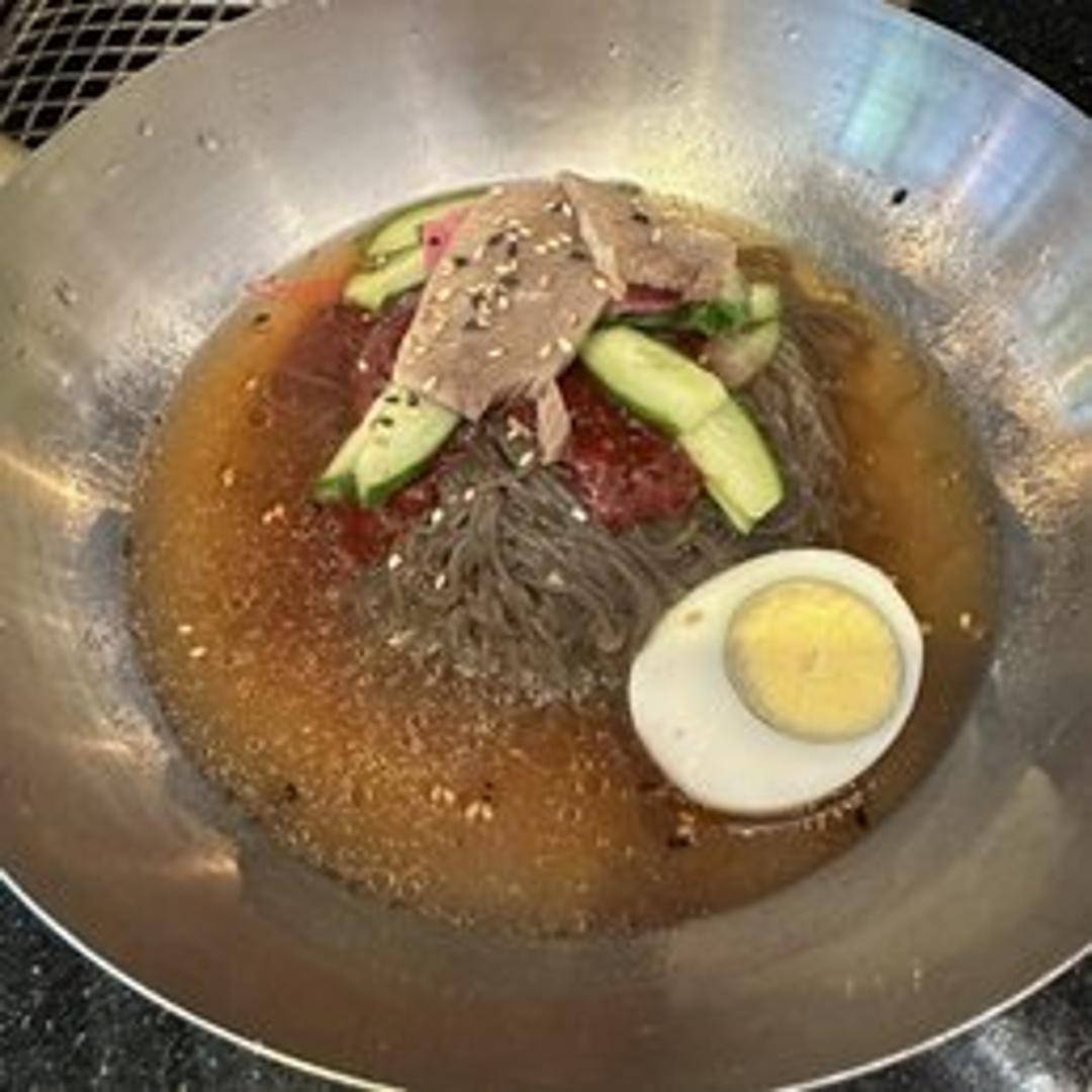 Cold buckwheat noodles mixed with a spicy and tangy sauce, topped with sliced vegetables, hard-boiled egg, and your choice of protein.