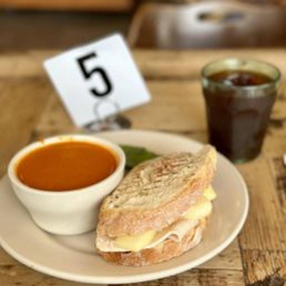 A creamy and comforting tomato soup, seasoned with aromatic herbs and spices. Served warm, it's the perfect complement to any sandwich or salad.