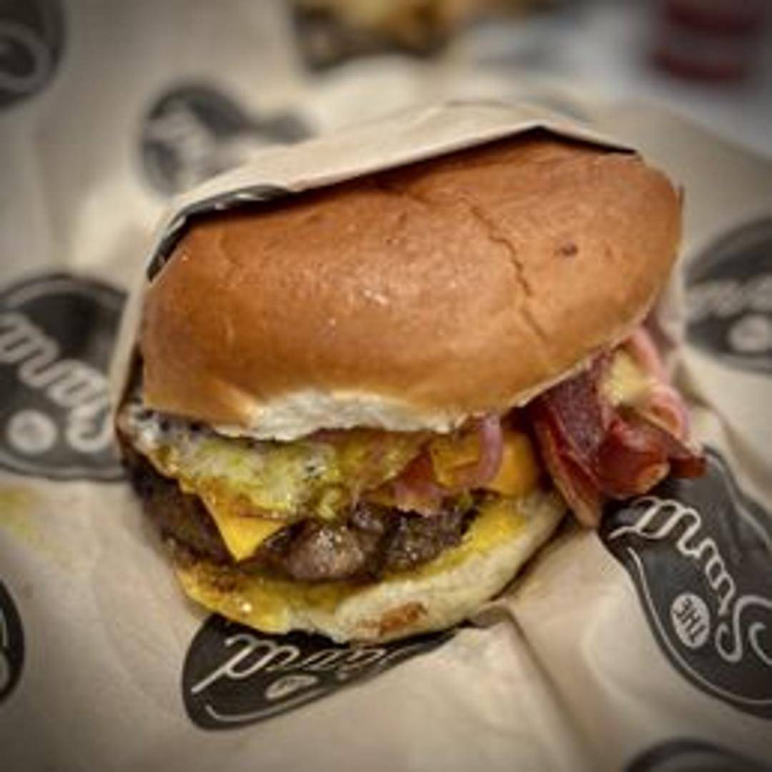 Juicy burger topped with bacon, cheese, and a fried egg.