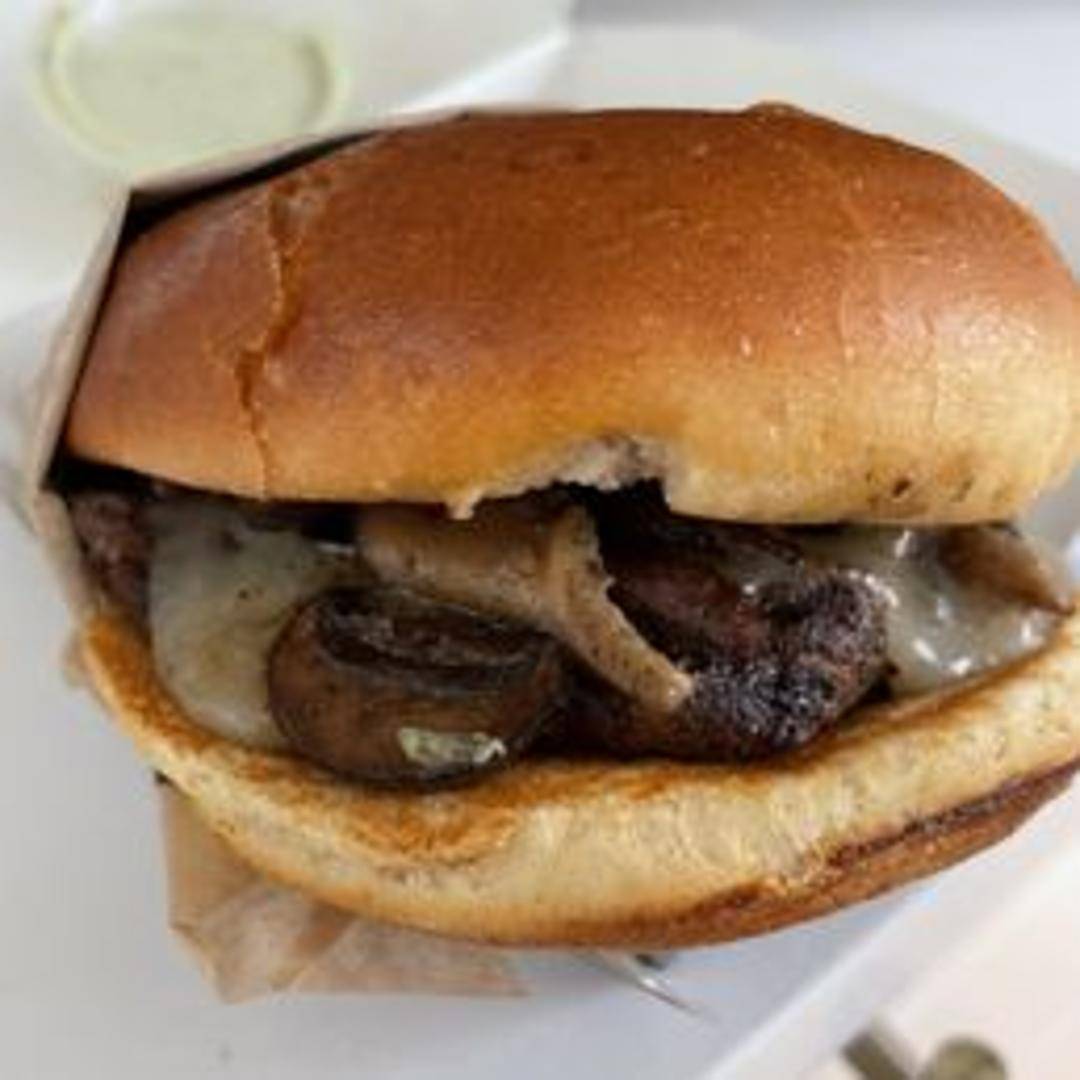Burger topped with melted Havarti cheese and sautéed mushrooms.