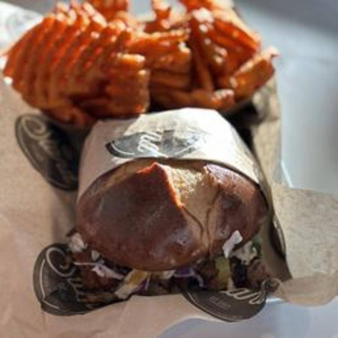 Slow-smoked brisket piled high on a pretzel roll with tangy BBQ sauce.